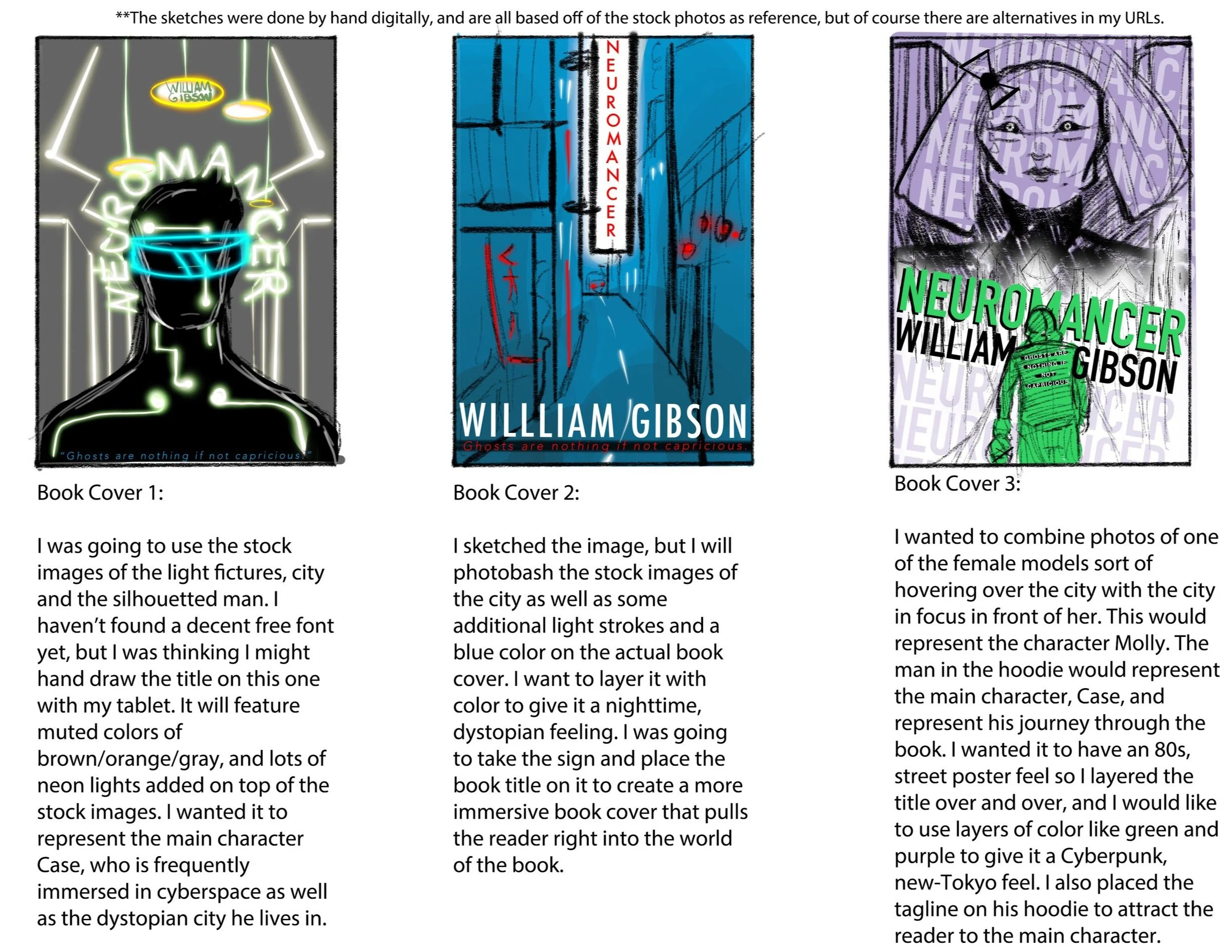 These were the original thumbnails and concepts I came up with while preparing for the re-design. I ended up focusing on the final sketch as my chosen design. I’d already been gathering stock photos in preparation and found a few that fit my theme. I wanted a grungy, 80s street poster vibe, with the title of the book layered over it with a Neo-Tokyo, Cyberpunk city in the background.